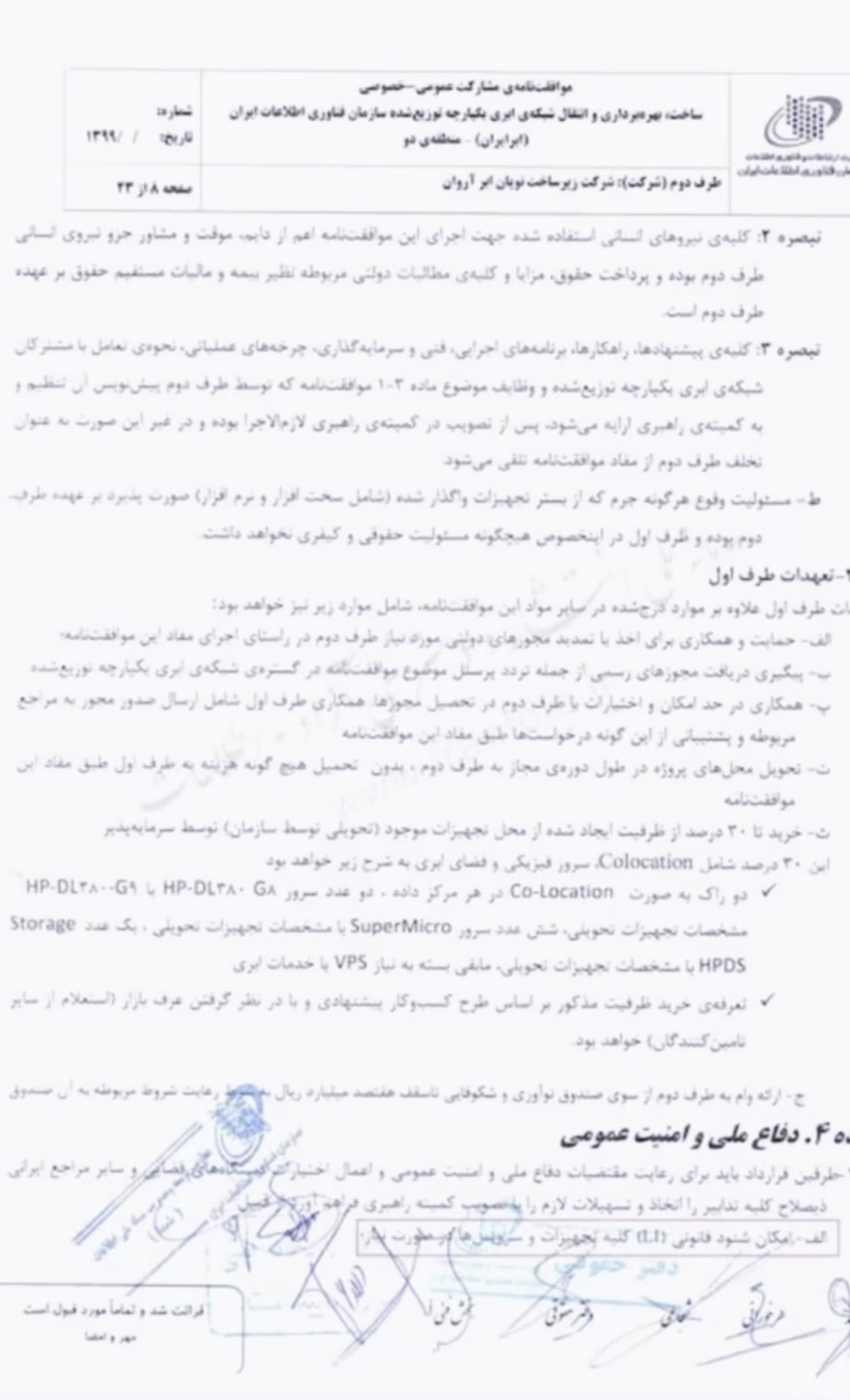 This document explicitly states that the project must comply with national defense and public security requirements: “طرفین قرارداد باید برای رعایت ملاحظات دفاع ملی و امنیت عمومی ” (“The parties to the agreement must comply with considerations of national defense and public security …”).